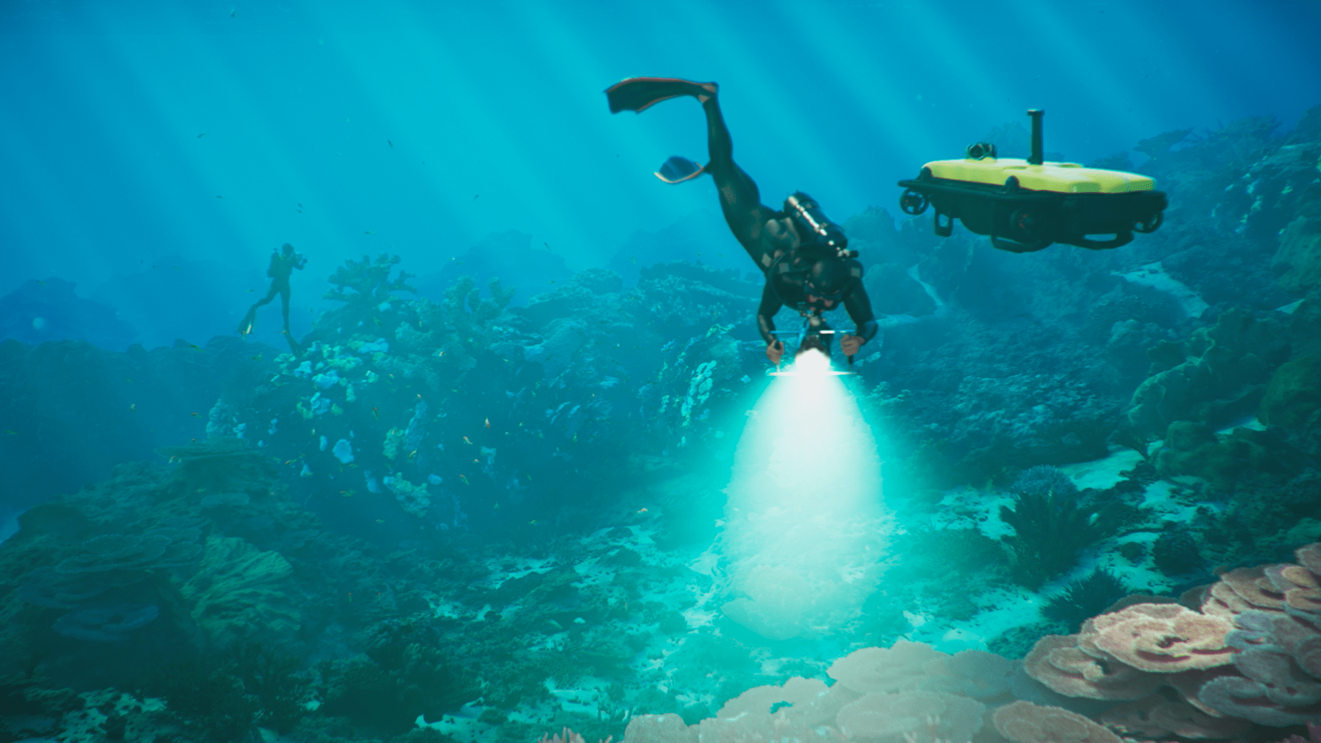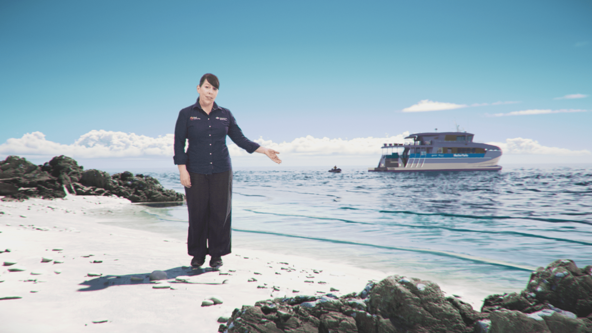 It was decided early on that a high-end 3D visualisation was the only way to do the Great Barrier Reef justice. Environments were built using Unreal Engine 5, with the sprawling reef ecosystems taking advantage of its ‘Nanite’ technology. Rather than sticking to simple narration, Ravel filmed GBRPMA representatives on greenscreen. The footage was composited back into Unreal Engine and integrated into the 3D scenes.