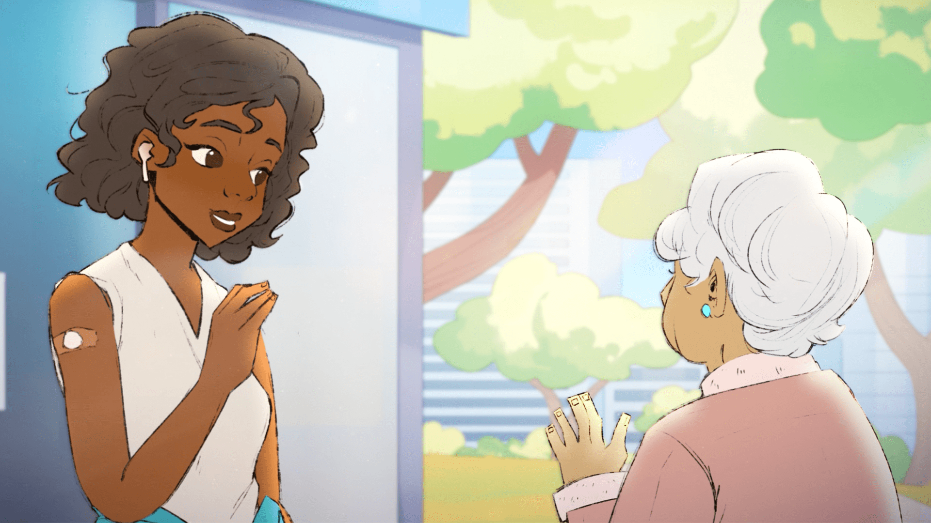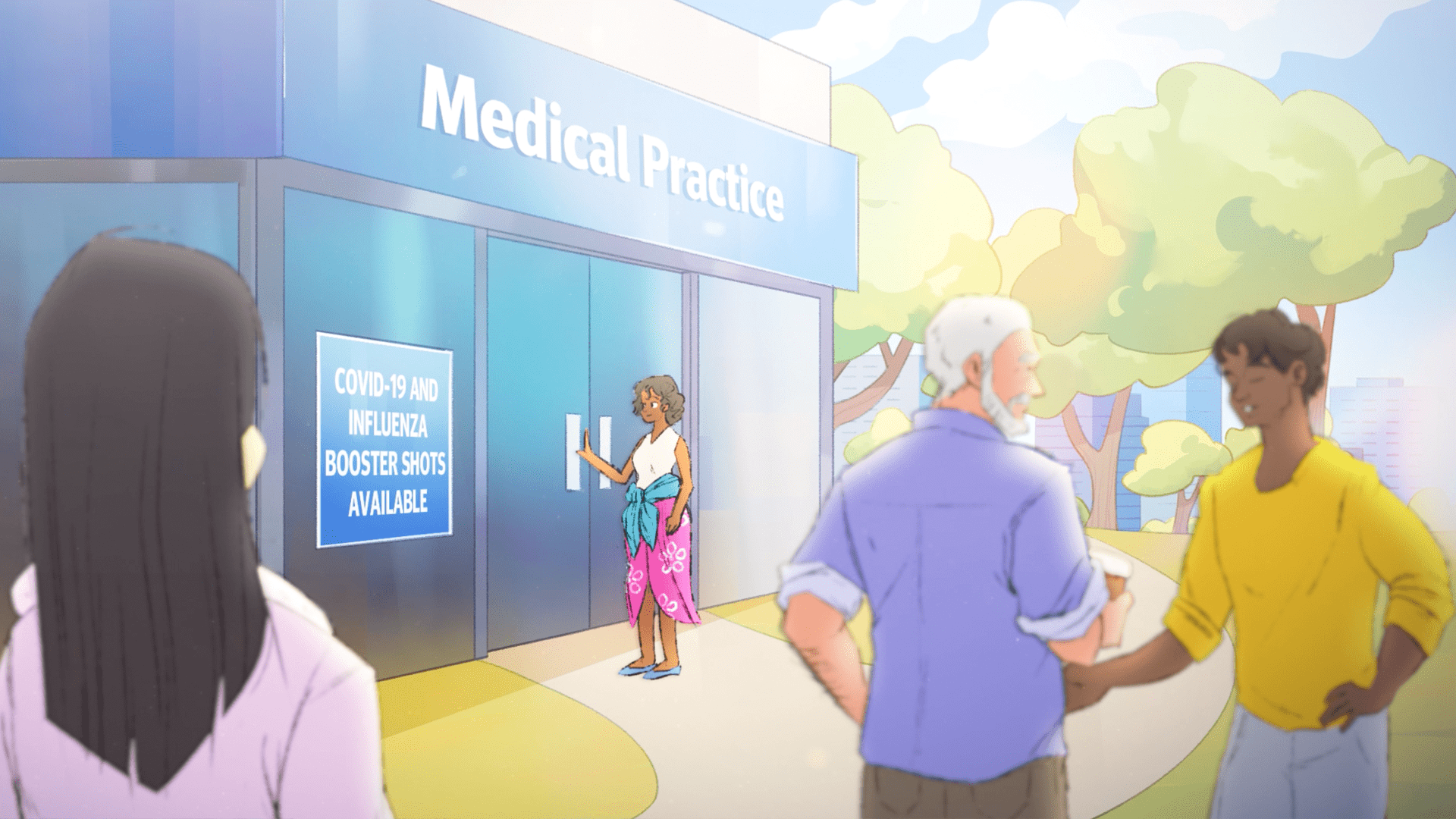 The previous video Ravel developed for GCPH video ‘Childhood Immunisation’ used an animation style reminiscent of children’s books. Target audience for this video was people aged between 25-60, so a more mature, hand-drawn illustration style was used, with character archetypes reflecting the diverse Gold Coast community. Messaging was framed around the idea that getting an influenza jab takes no time at all and is entirely free.